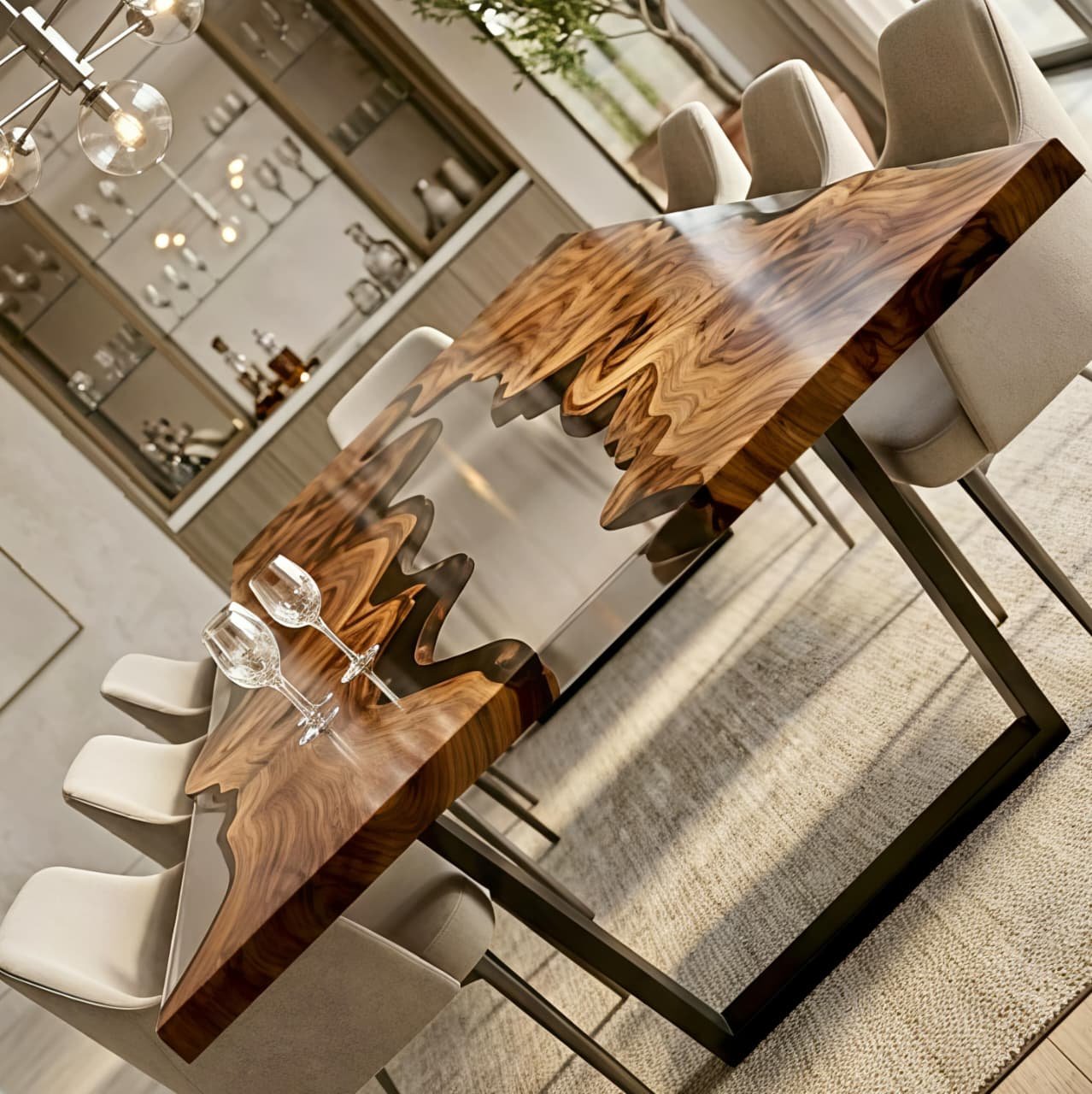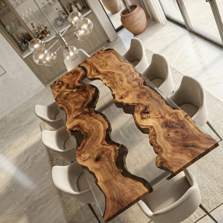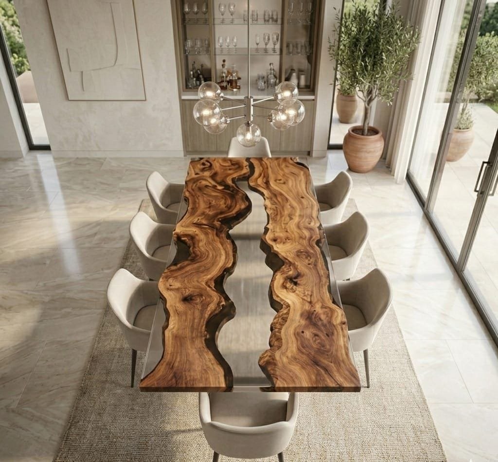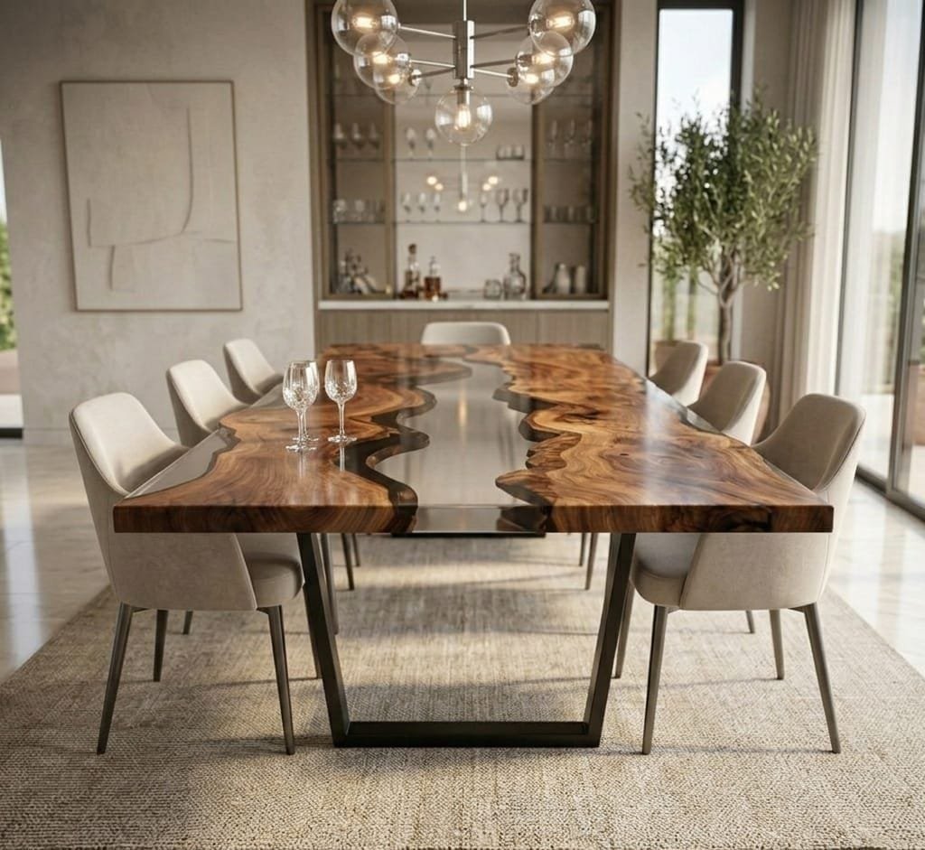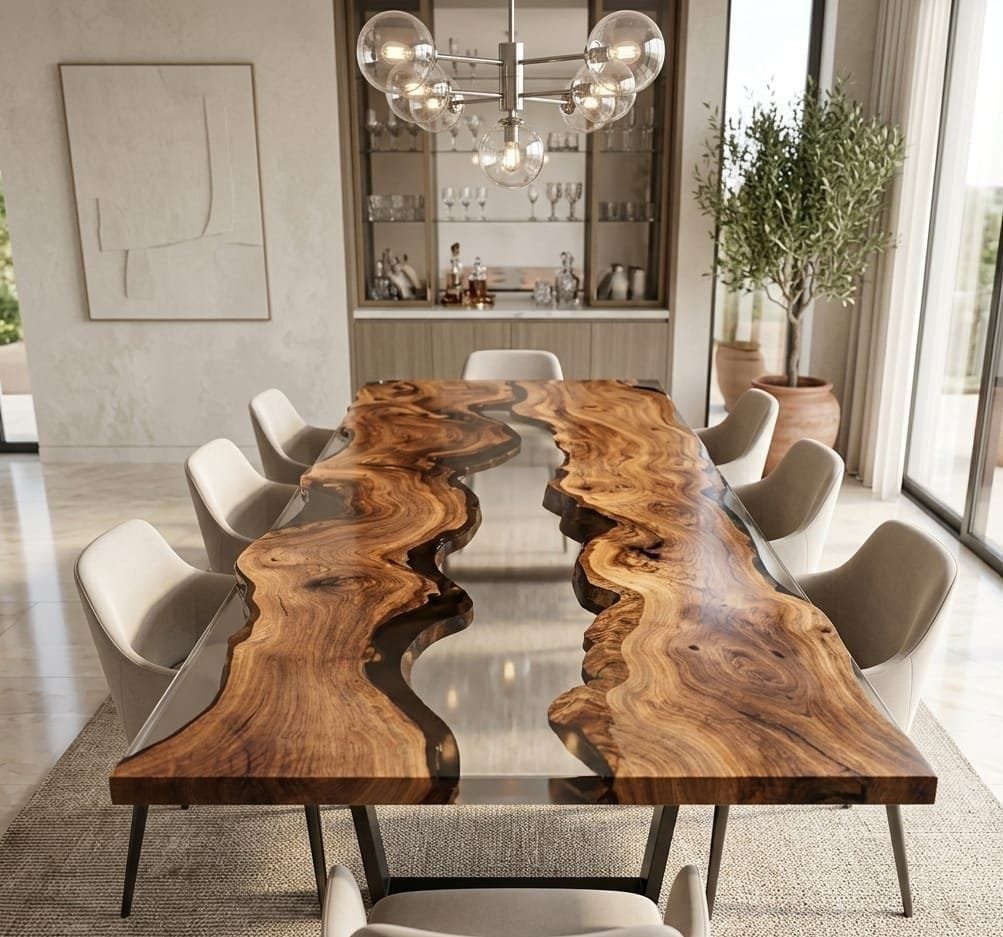 A stylish rectangular epoxy table crafted for dining and workspace use, combining durability with modern aesthetics.