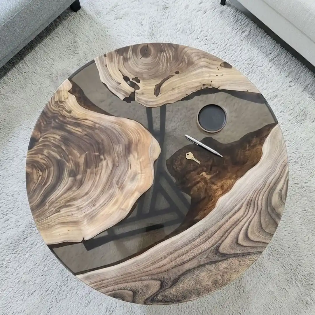 The smooth, glossy epoxy finish enhances the natural grain of the wood while adding durability and resistance to daily wear. Its round shape makes it perfect for cozy gatherings, coffee corners, or statement décor in living rooms.